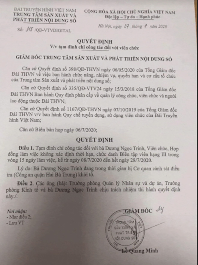 Trước đó, Trung tâm Sản xuất và Phát triển nội dung số (Đài Truyền hình Việt Nam) đã có quyết định tạm đình chỉ công tác đối với bà Dương Ngọc Trinh với lý do bà Dương Ngọc Trinh đang trong thời gian bị Cơ quan CSĐT Công an quận Hai Bà Trưng khởi tố.