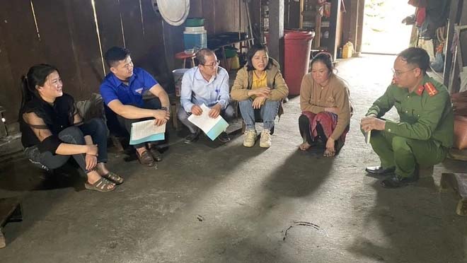 Lực lượng Công an phối hợp với chính quyền địa phương tuyên truyền gia đình hành vi vi phạm pháp luật về tảo hôn, hôn nhân cận huyết thống.