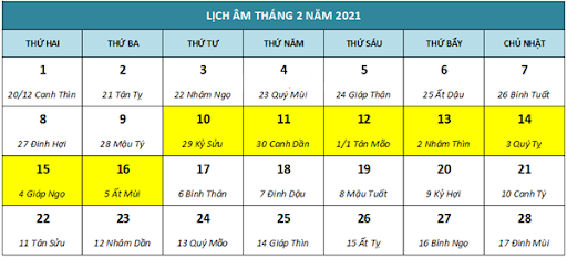 Phương án 1: Công chức, viên chức nghỉ Tết Nguyên đán là 7 ngày liên tục. Do ngày mùng 2 và mùng 3 Tết Nguyên đán (tức ngày 13-14 tháng 2/2021 dương lịch) trùng vào thứ Bảy và Chủ nhật là ngày nghỉ hằng tuần, công chức, viên chức sẽ nghỉ bù vào ngày mùng 4 và mùng 5 Tết Nguyên đán (tức ngày 15-16 tháng 2/2021 dương lịch).
