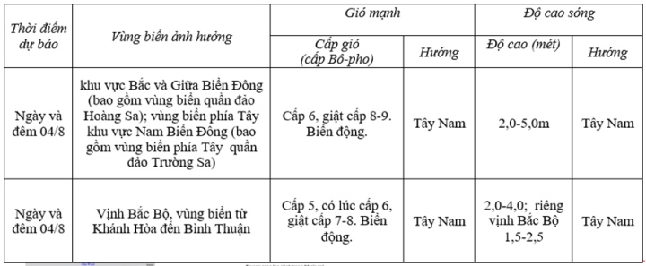 Ngày và đêm 5/8, ở vịnh Bắc Bộ, vùng biển từ Khánh Hòa đến Bình Thuận gió Tây Nam mạnh cấp 5, có lúc cấp 6, giật cấp 8-9, biển động, sóng biển cao 1,5-3 m. Bắc và giữa Biển Đông (bao gồm vùng biển quần đảo Hoàng Sa), vùng biển phía Bắc của khu vực Nam Biển Đông (bao gồm vùng biển phía Bắc quần đảo Trường Sa) gió Tây Nam mạnh cấp 6, giật cấp 8-9, biển động, sóng biển cao 2-3 m, Bắc Biển Đông 3-5 m.