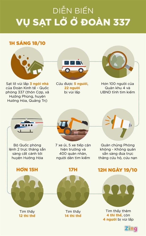 Sáng 19/10, lực lượng cứu hộ, cứu nạn đã tìm thấy thêm 4 thi thể trong vụ sạt lở đất ở Đoàn 337 (thôn Cợp, xã Hướng Phùng, huyện Hướng Hóa, Quảng Trị). Hiện còn 4 cán bộ, chiến sĩ mất tích.