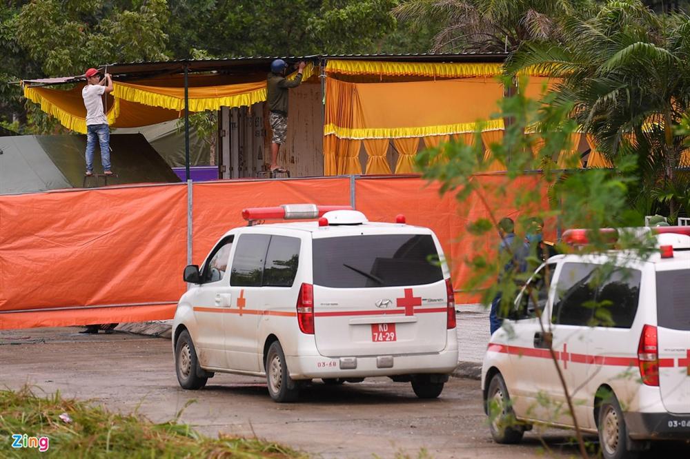 Trời bắt đầu mưa ở TP Đông Hà. Quân đội chuẩn bị một lán trại ngay lối vào nhà thi đấu để thân nhân nạn nhân tạm trú.