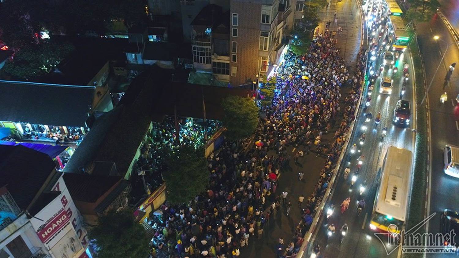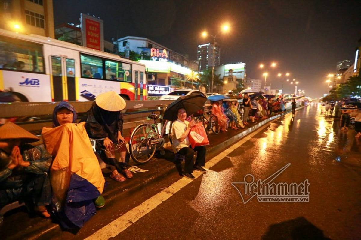 19h, phía bên ngoài chùa Phúc Khánh, người dân ngồi chiếm gần hết lòng đường Tây Sơn, dưới chân cầu vượt Ngã Tư Sở, kéo dài khoảng 300m