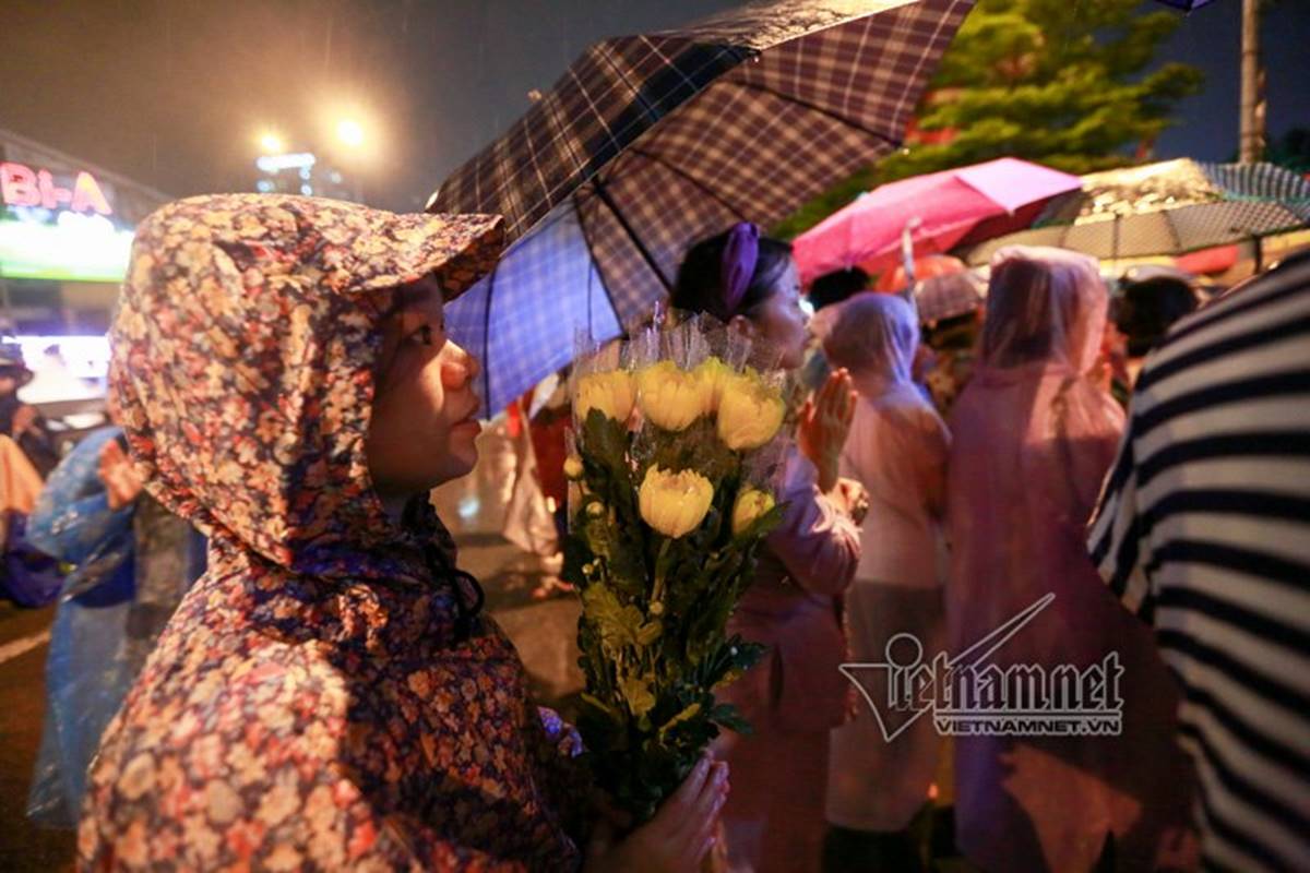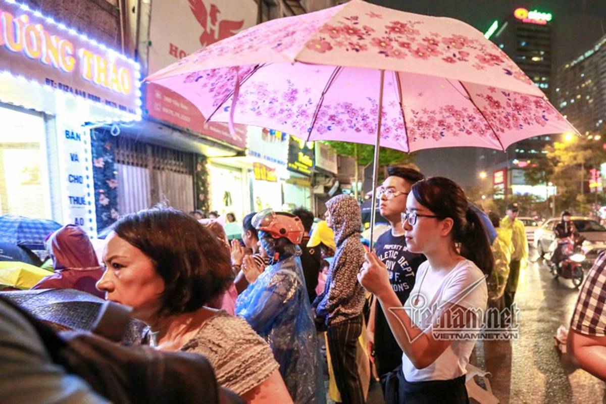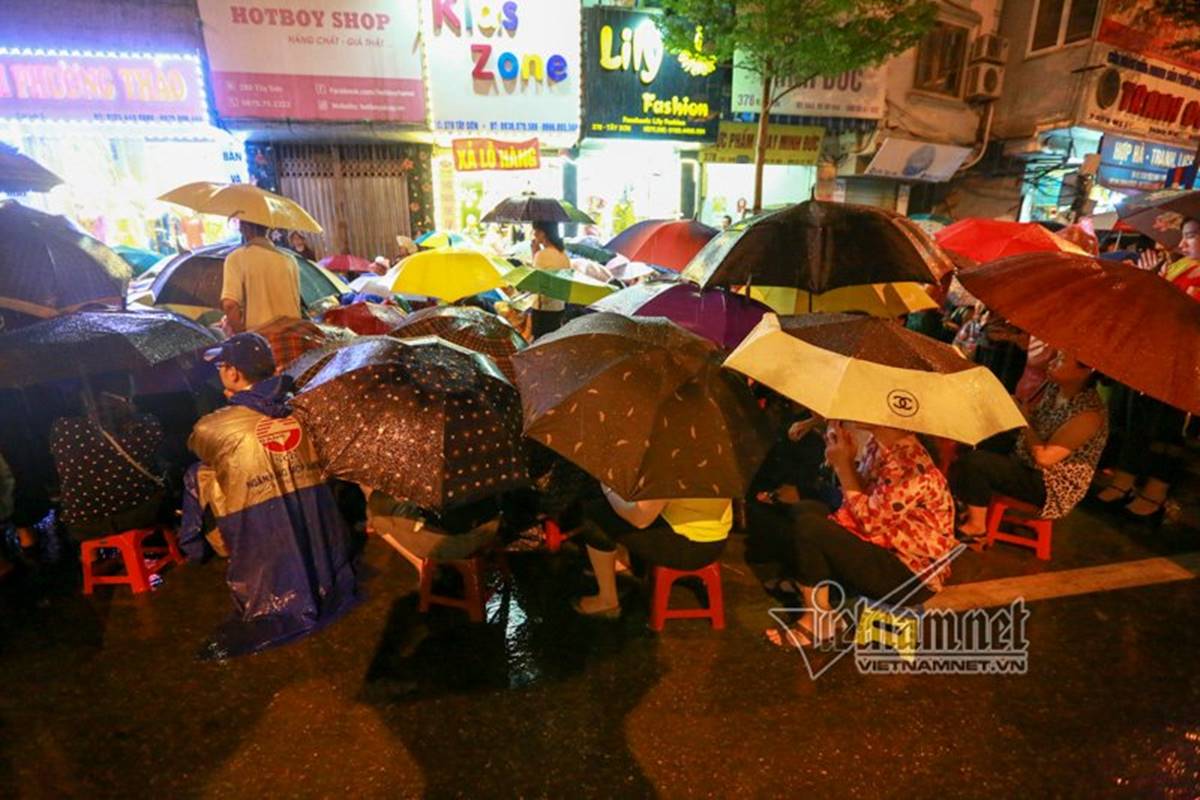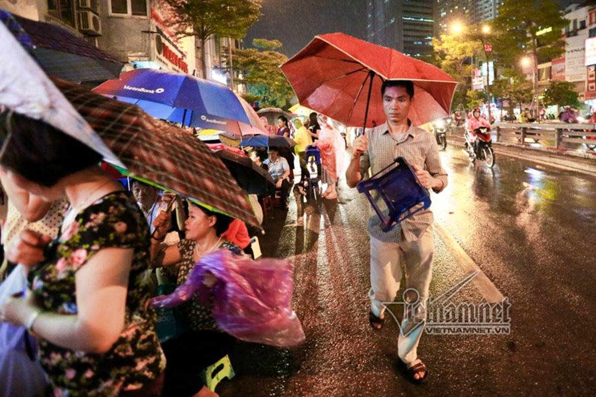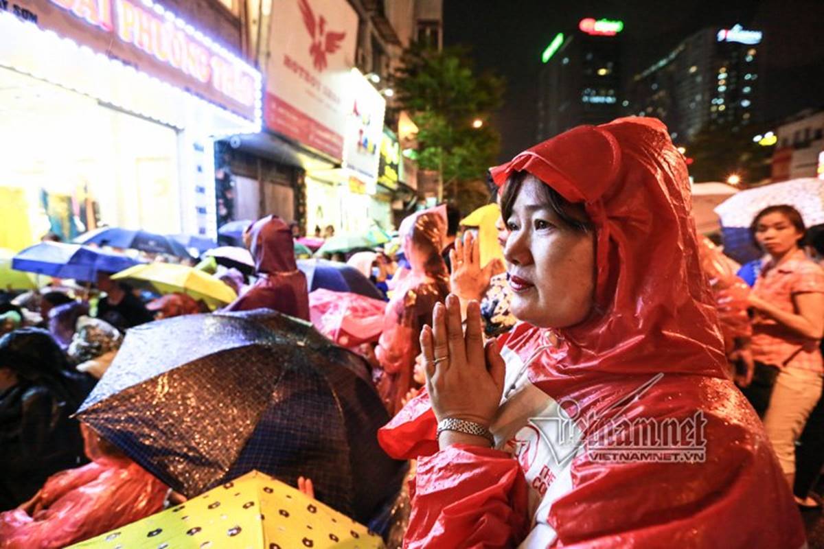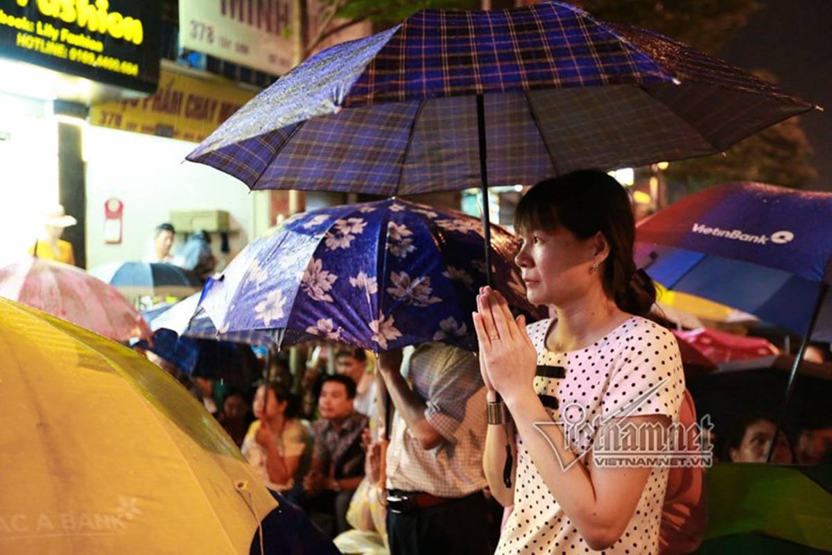 Trời mưa to nên người dân vừa phải che ô vừa khấn vái