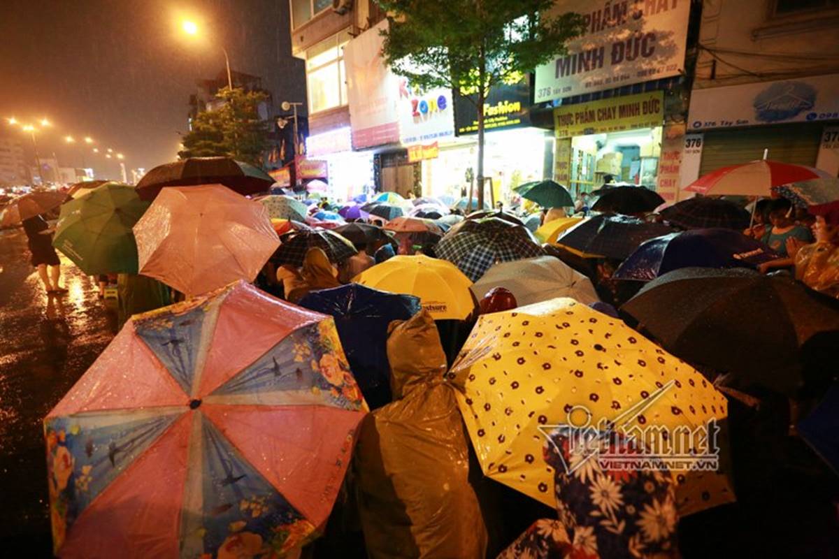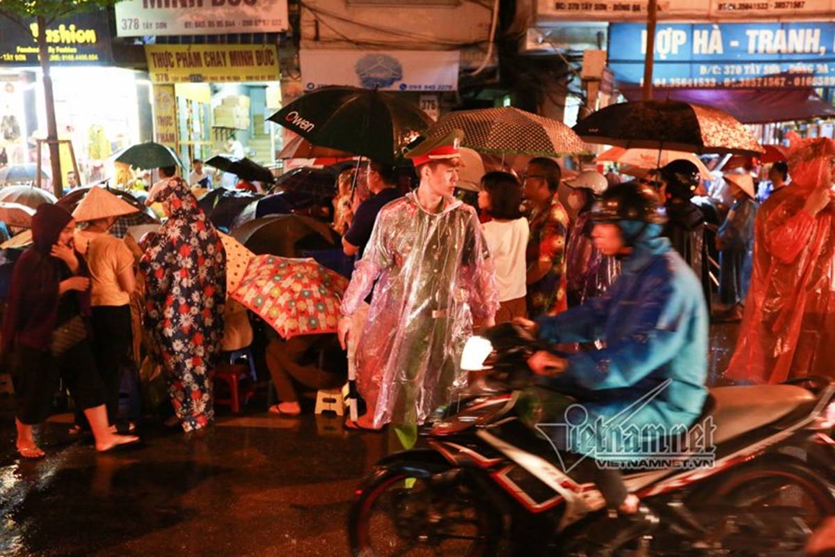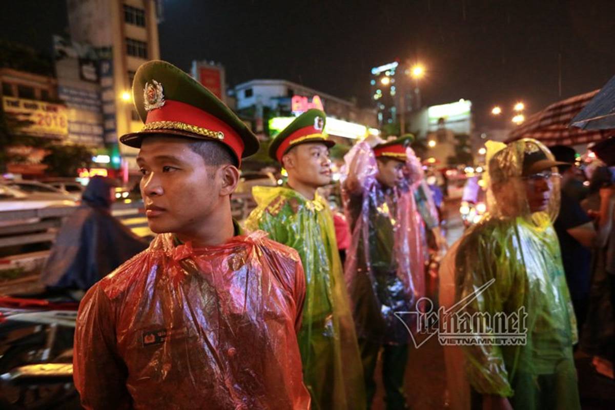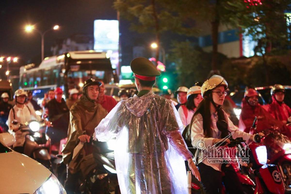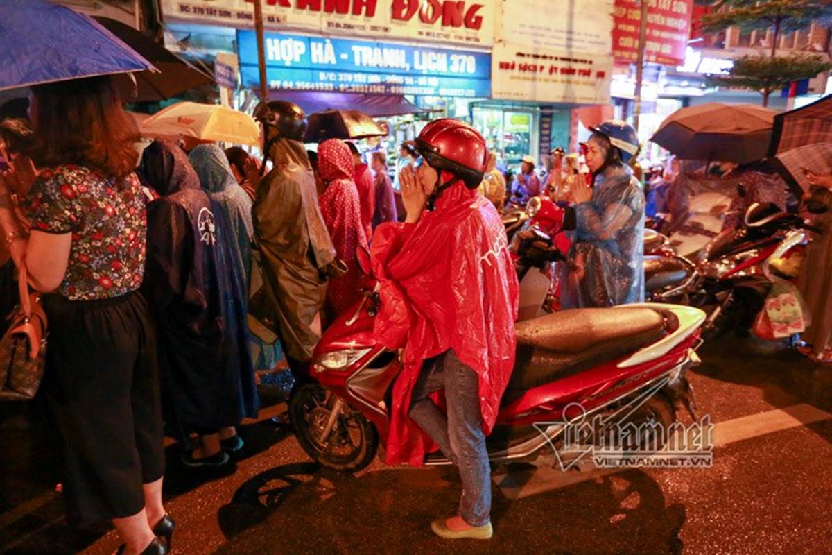 Càng về chiều muộn trời mưa càng to, người dân đổ về đây càng nhiều hơn. Gần 30 cán bộ chiến sĩ công an phường Ngã Tư Sở cùng lực lượng dân phòng căng mình làm nhiệm vụ đảm bảo an toàn cho người dân đi lễ chùa.