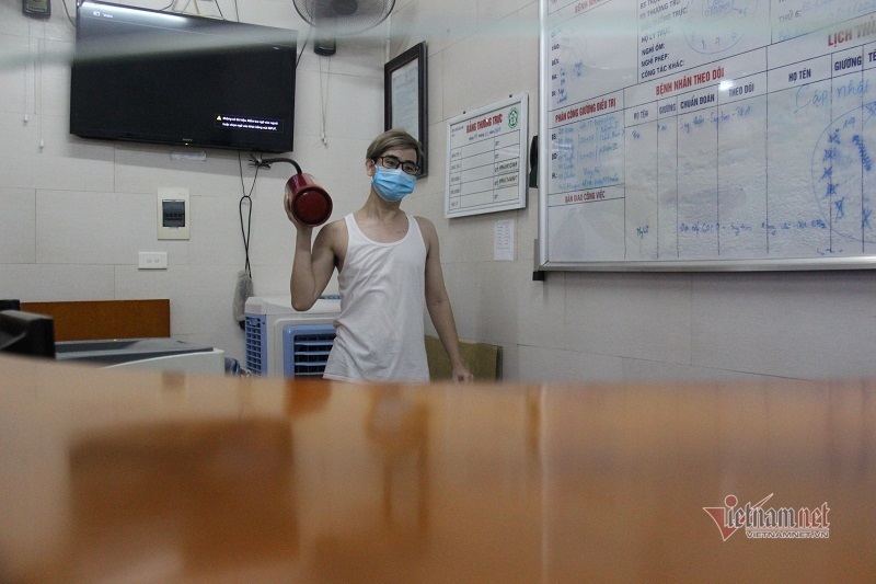 "Cứ khoảng 5h chiều, cán bộ, nhân viên trong khoa chia thành các tốp nhỏ để tập thể dục. Vì trong khu cách ly nên một số dụng cụ còn thiếu, chúng tôi đành trưng dụng các vật dụng để tập luyện, kể cả bình cứu hỏa cũng được dùng để tập tạ", bác sỹ Nguyễn Quốc Thái cười sảng khoái.
