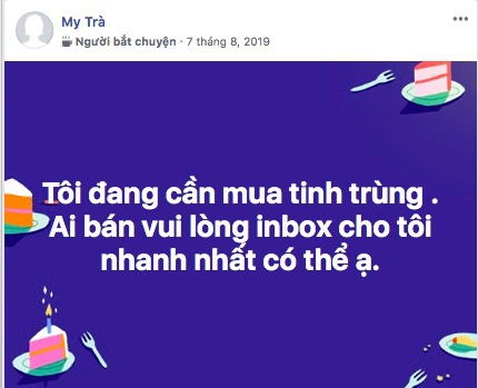 Facebook có tên Vũ Quang Thu rao: "Em có một số các bạn nam hiến tinh trùng nhân đạo, có vợ chồng nào hiếm muộn hay ai muốn làm mẹ đơn thân nhắn tin kín em nhé, qua đường trực tiếp hay bệnh viện đều được".