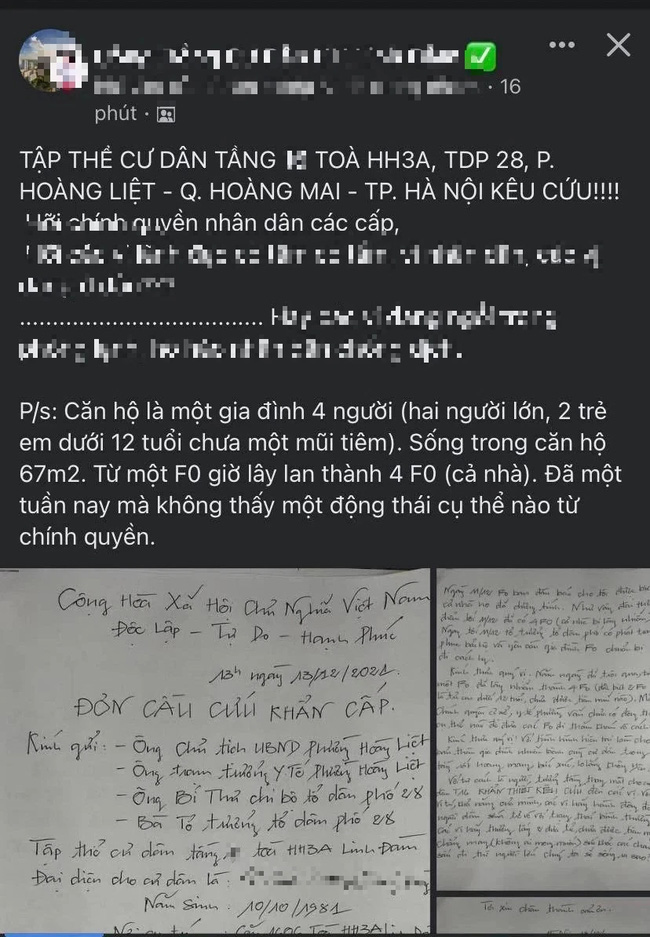 Tối ngày 14/12, mạng xã hội xuất hiện đoạn nội dung kèm hình ảnh lá đơn cầu cứu của các cư dân sống tại chung cư HH3A Linh Đàm, phường Hoàng Liệt, quận Hoàng Mai, Hà Nội gửi tới lãnh đạo UBND phường phản ánh về việc tại tầng có gia đình 4 F0 nhưng cho tới nay sau 5 ngày kể từ khi phát hiện ca nhiễm đầu tiên vẫn chưa được đưa đi cách ly hay có biện pháp gì trong công tác phòng chống dịch.