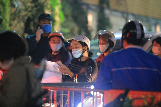 Nhân viên y tế làm việc đến tối muộn, hướng dẫn cư dân khai báo y tế.