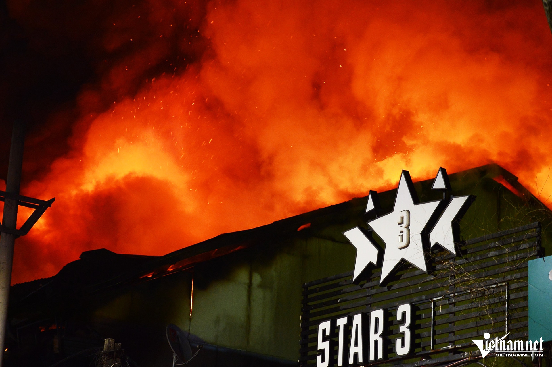 Sau ít phút, ngọn lửa bùng lên dữ dội và lan ra khắp quán với diện tích khoảng 300m2, cao 2 tầng, tầng trên lợp mái tôn.