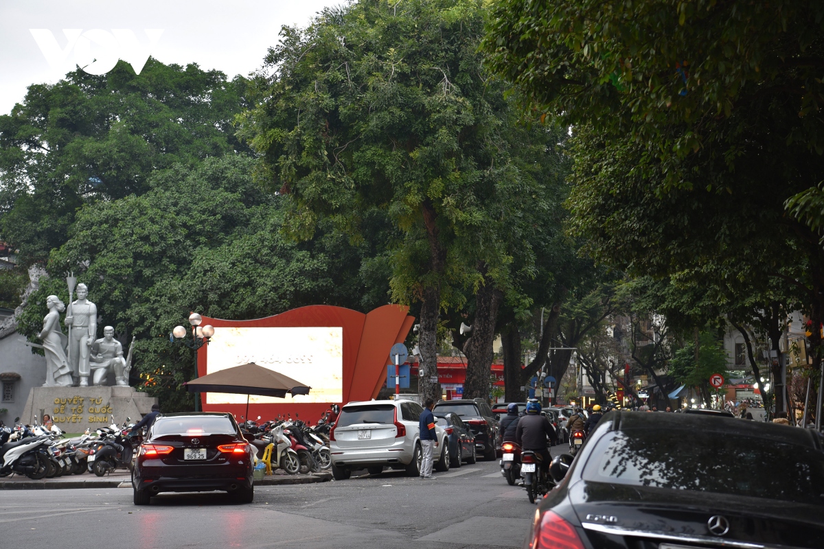 Điểm trông giữ xe tại Tượng đài “Quyết tử để Tổ quốc quyết sinh” nằm tại vườn hoa Vạn Xuân, đền Bà Kiệu (quận Hoàn Kiếm) ô tô xếp hàng 2 bên tuyến phố Hàng Dầu.