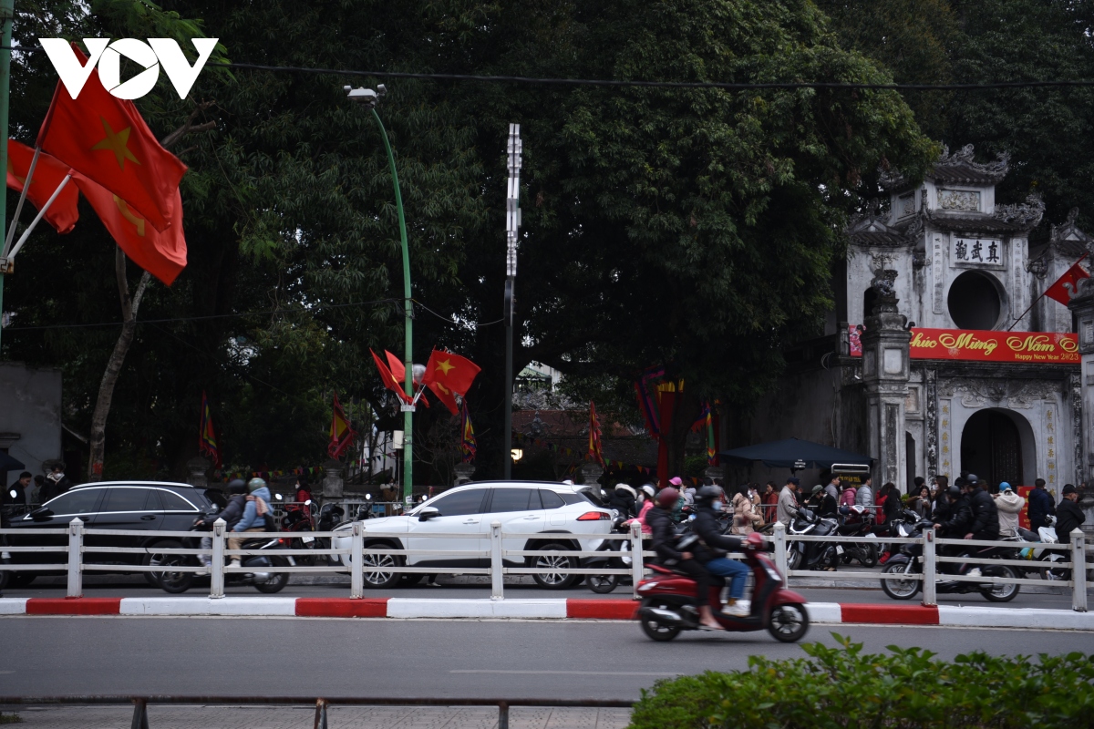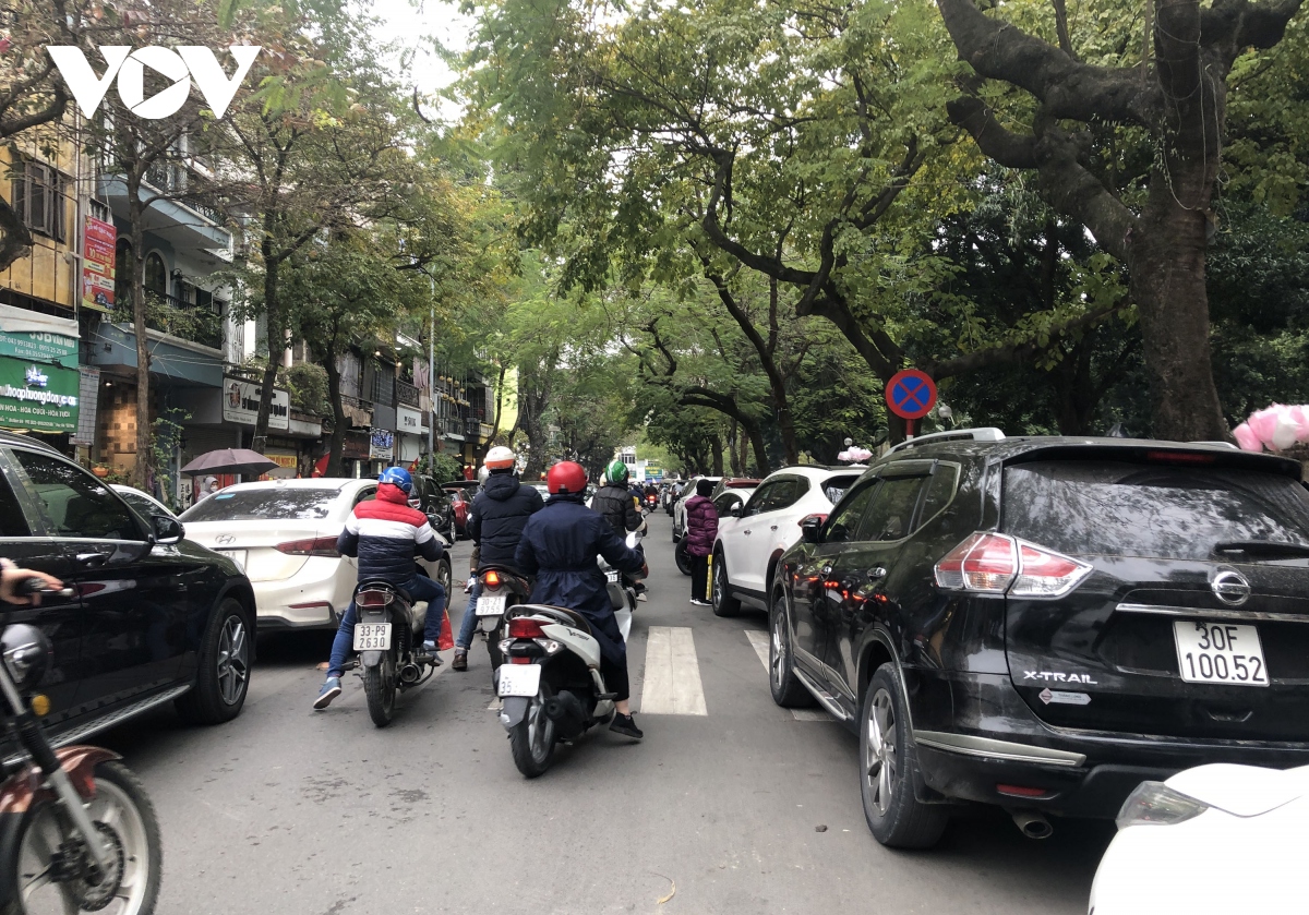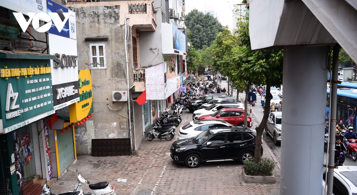 Vỉa hè, lòng đường các tuyến phố Quốc Tử Giám, Văn Miếu, Nguyễn Thái Học kín các bãi trông giữ phương tiện.