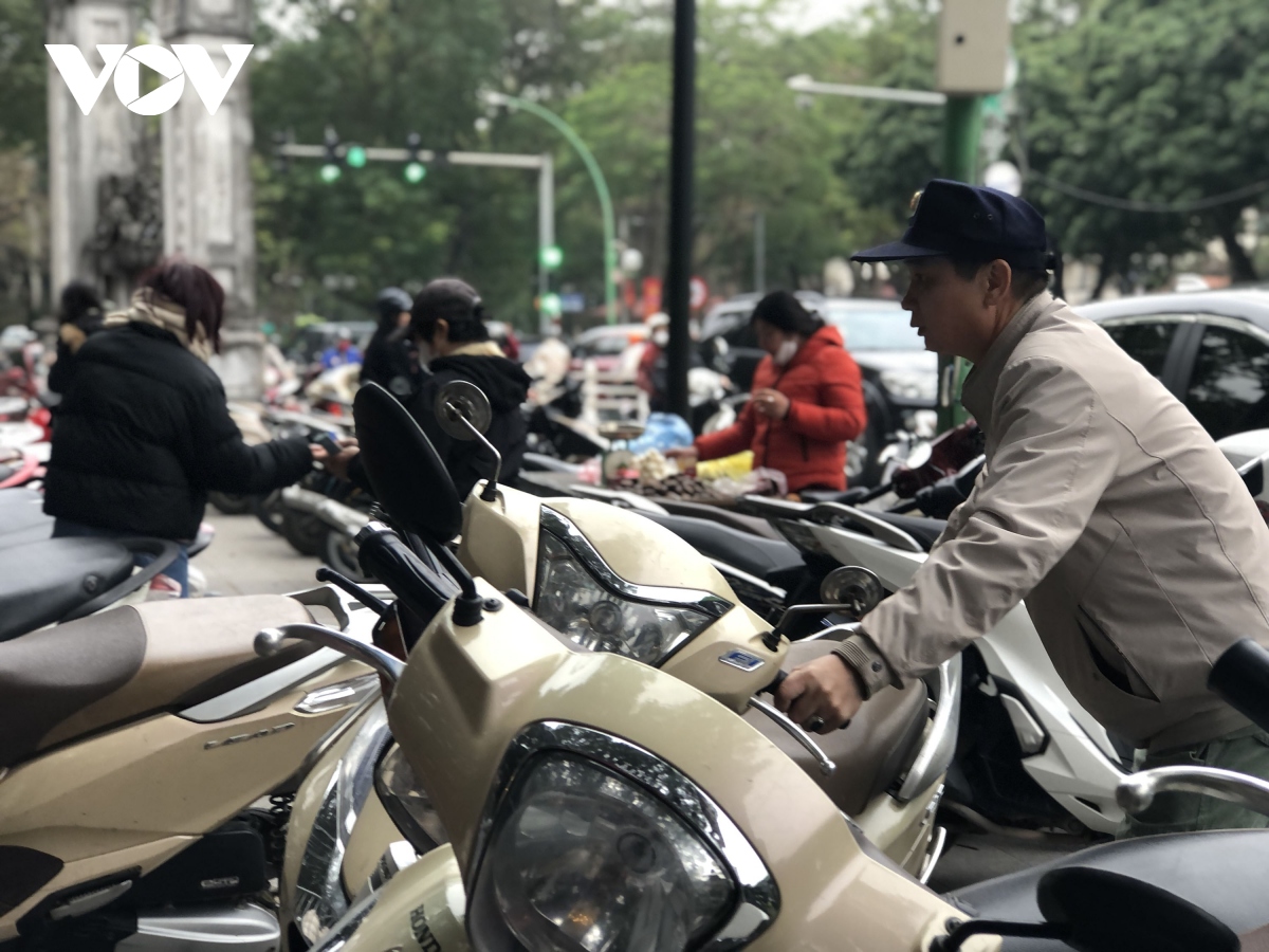 Cảnh sát kiểm tra một trường hợp đỗ xe trước cửa Đền Quán Thánh. Theo phân cấp, các điểm trông giữ xe dưới lòng đường Sở GT-VT quản lý, trên vỉa hè các quận, huyện quản lý. Để phục vụ nhu cầu của thăm viếng chùa đầu năm của người dân xung quanh các di tích được quận cấp phép tạm trông giữ phương tiện. Tuy nhiên, thực tế nhiều điểm trông giữ phương tiện sử dụng quá diện tích cấp, tranh thủ trông giữ cả ô tô trên vỉa hè, dưới lòng đường.