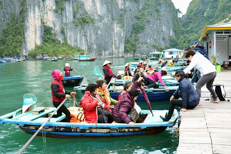 Khoảng 10h sáng cùng ngày, các du khách xuống 3 đò chèo tay của Công ty du lịch Việt Á Victory để di chuyển vào Hang Luồn ở đảo Bồ Hòn.