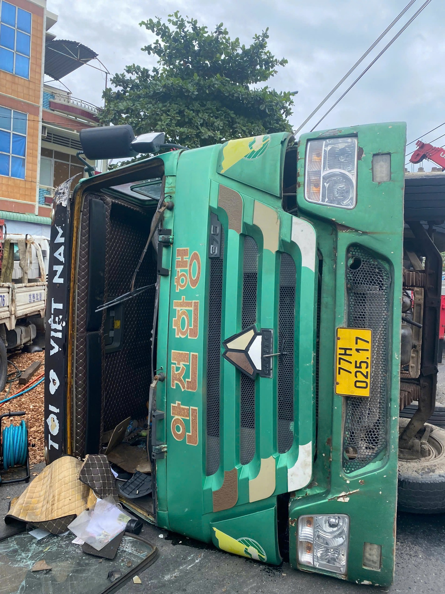 Khi đến khu vực phường Quang Trung, TP Quy Nhơn, xe tải bất ngờ lật nghiêng, đè trúng 3 người đi trên 2 xe máy.
