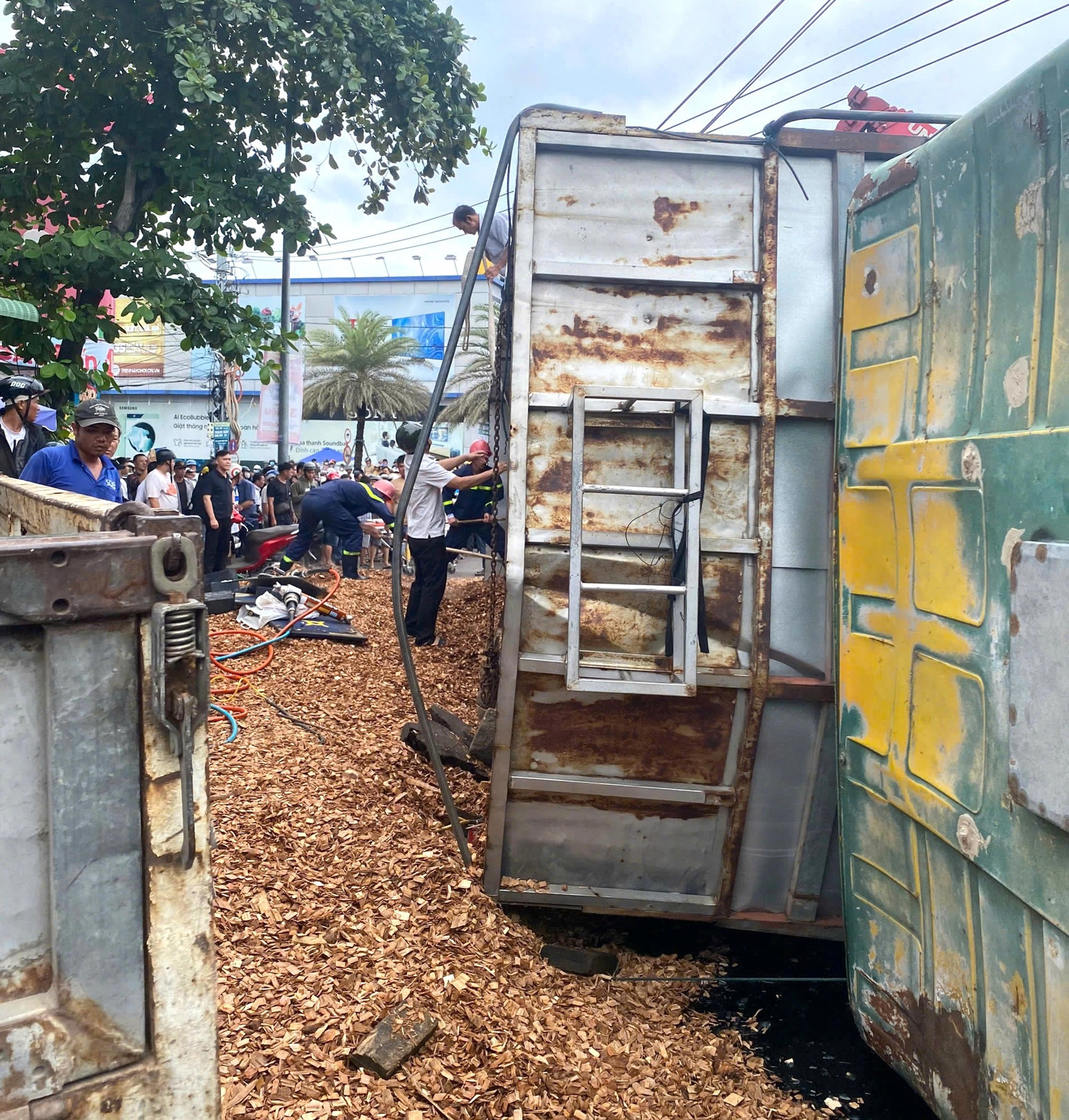 Xe chở gỗ dăm bị lật nghiêng. Ảnh: Thanh Thắng