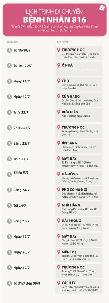 Bệnh nhân số 816, SN 1981 ở Tòa A3 Chung cư Vicoland, phường Nại Hiên Đông, quận Sơn Trà, TP Đà Nẵng. Bệnh nhân này đang là giáo viên một trường THPT tại Đà Nẵng, trước khi dương tính với SARS-CoV-2 nữ bệnh nhân đi chuyển rất nhiều nơi.