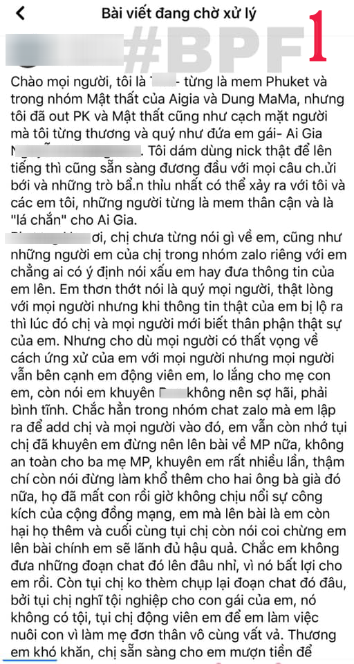 Cụ thể, một thành viên tự xưng là từng trong "mật thất" của Phuket có tên N.T đã đăng đàn một bài dài, kèm theo những tin nhắn, hình ảnh của Aigia. Theo N.T chia sẻ thì cô nàng không thể chịu được những trò "bẩn" mà Aigia và Dung Mama đã làm nên cô nàng này phải lên tiếng dù biết sẽ bị chửi rủa.