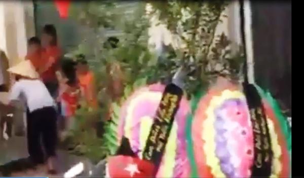 Nhóm đối tượng mang vòng hoa đến nhà trưởng công xã đòi nợ (ảnh cắt từ clip)