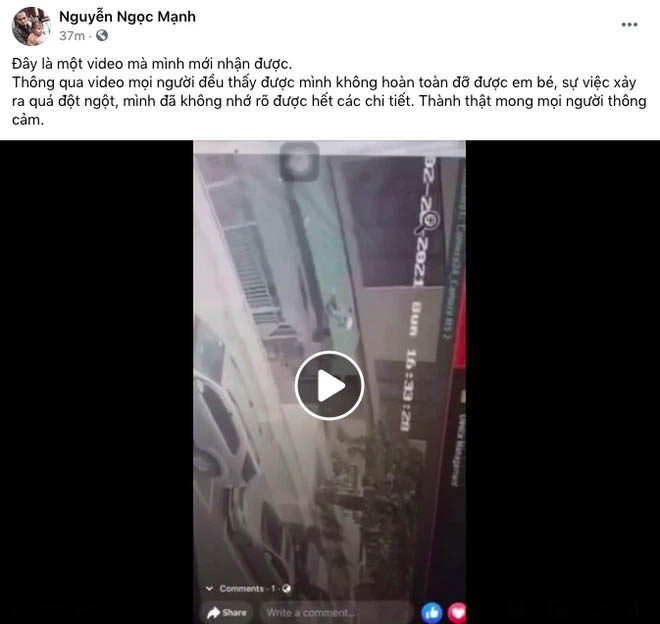Trên Facebook cá nhân, anh Mạnh cũng chia sẻ lại video này cùng lời nhắn: "Đây là một video mà mình mới nhận được. Thông qua video mọi người đều thấy được mình không hoàn toàn đỡ được em bé, sự việc xảy ra quá đột ngột, mình đã không nhớ rõ được hết các chi tiết. Thành thật mong mọi người thông cảm"