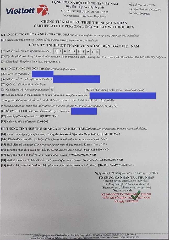Theo quy định, ông D. có nghĩa vụ nộp thuế thu nhập cá nhân tại nơi phát hành vé TPHCM, với tổng giá trị 9,6 tỷ đồng (10% phần giá trị vượt trên 10 triệu đồng) và được khấu trừ ngay khi nhận thưởng.