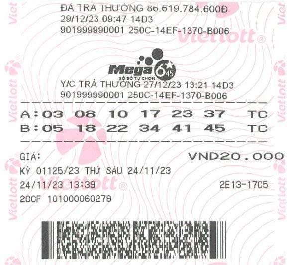 Qua kiểm tra trên hệ thống dữ liệu kinh doanh xổ số tự chọn và hồ sơ cá nhân kèm theo, Vietlott xác định ông D. đã trúng giải Jackpot xổ số tự chọn Mega 6/45 kỳ quay số mở thưởng 01125 ngày 24/11/2023. Giá trị trúng thưởng 96,2 tỷ đồng. Bộ số trúng thưởng gồm: 05 - 18 - 22 - 34 - 41 - 45.