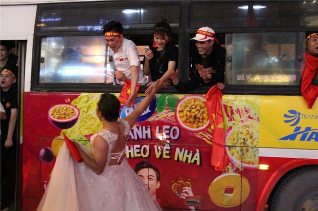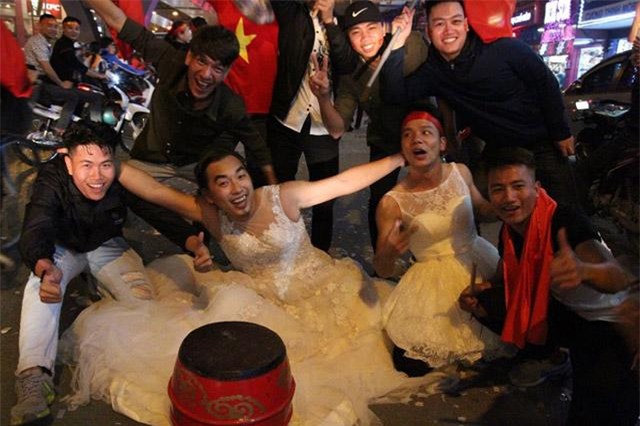 Các chàng trai không ngại ngần thuê váy cưới và mặc xuống đường ăn mừng chiến thắng thu hút sự quan tâm của nhiều người.