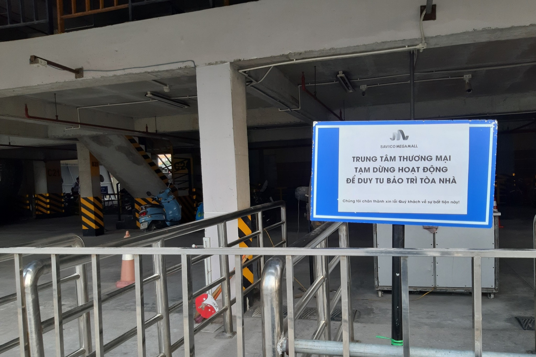 Ở bên ngoài trung tâm thương mại có biển thông báo tạm dừng hoạt động