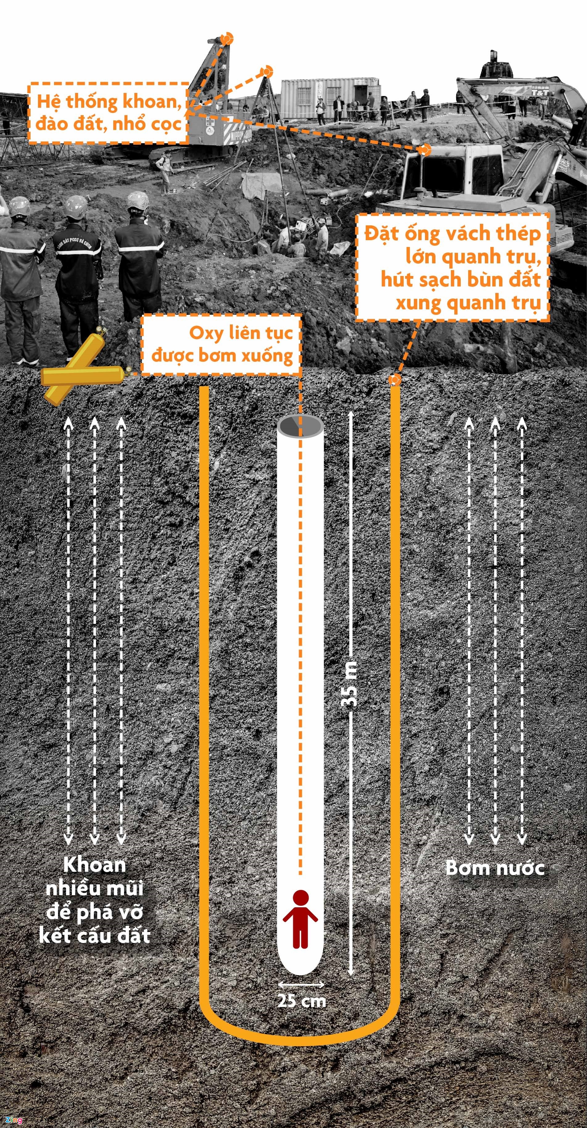 Phương án giải cứu bé Nam là làm loãng địa chất xung quanh để tiến hành nhổ ống cọc bê tông. Đồ hoạ: Duy Anh.