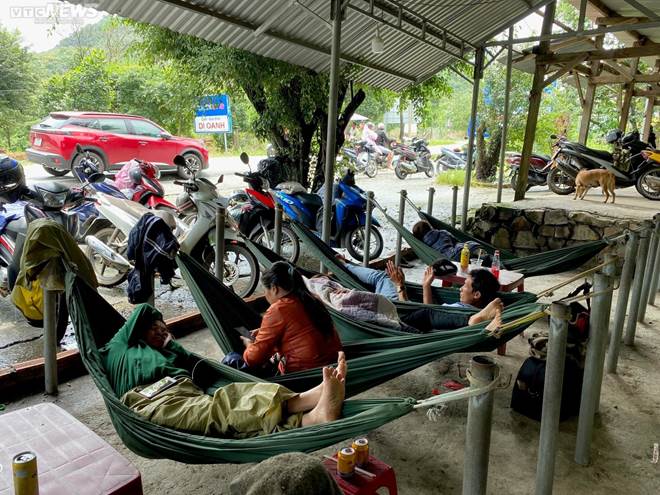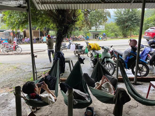 Nhiều người dân buộc phải dừng chân, tìm các quán nghỉ, nằm võng nhiều giờ liền chờ thông xe để qua bên kia đèo.