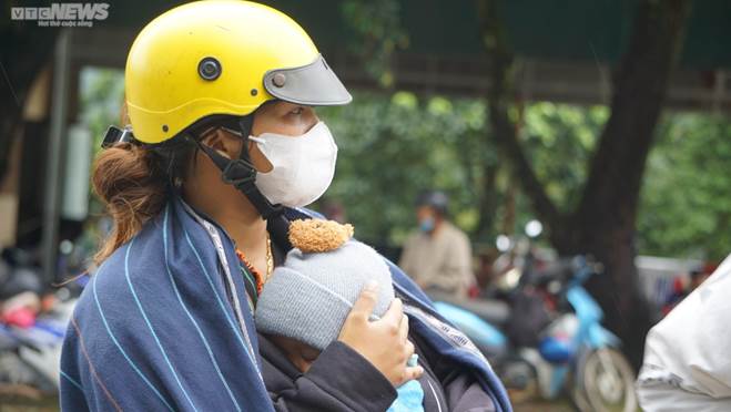 Một em bé ngủ trên tay mẹ trong lúc chờ được di chuyển bình thường trở lại.