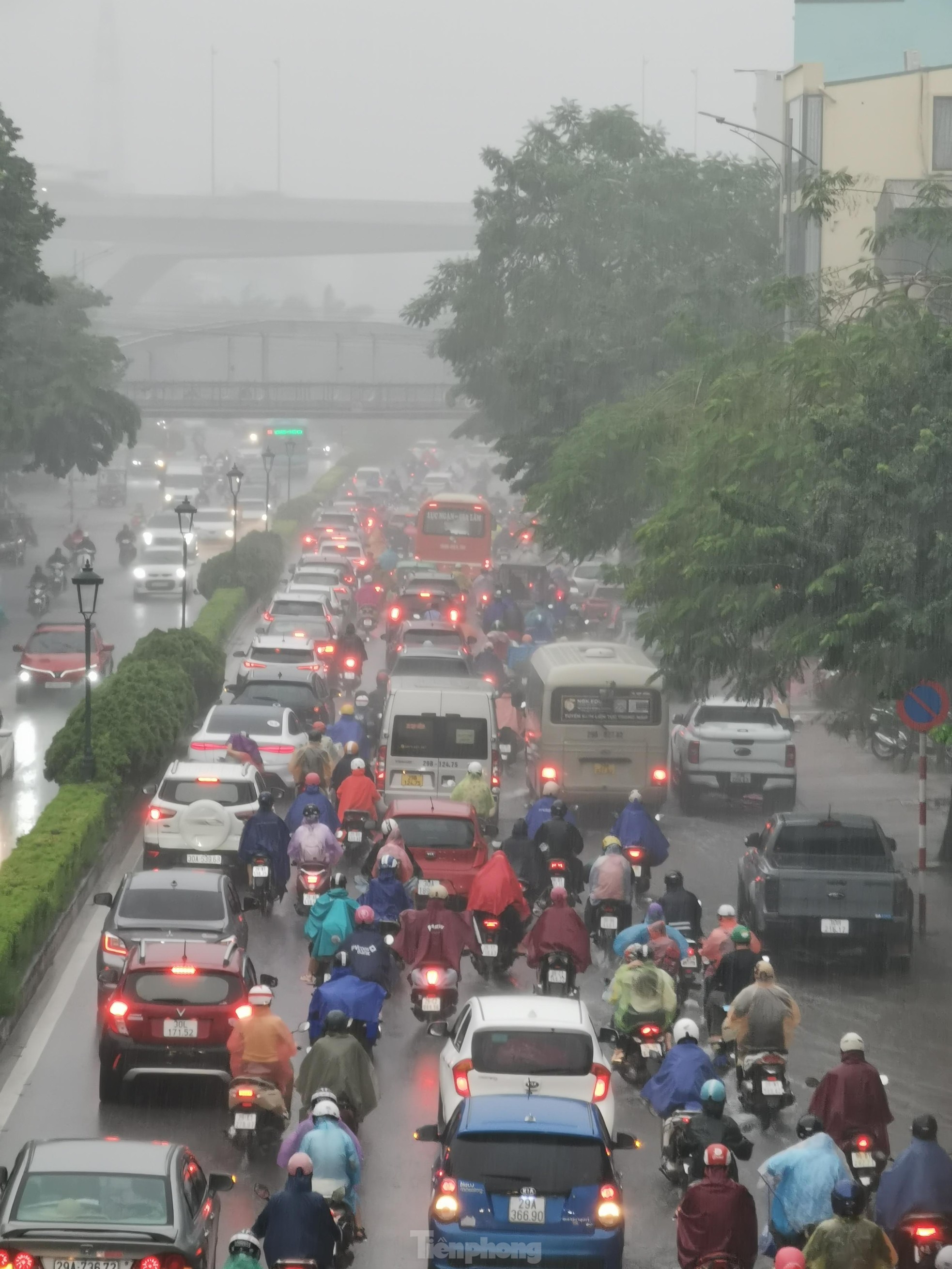 Tại đường Nguyễn Văn Cừ (quận Long Biên) lúc hơn 17 giờ, trời mưa to, các chủ phương tiện di chuyển khó khăn. |