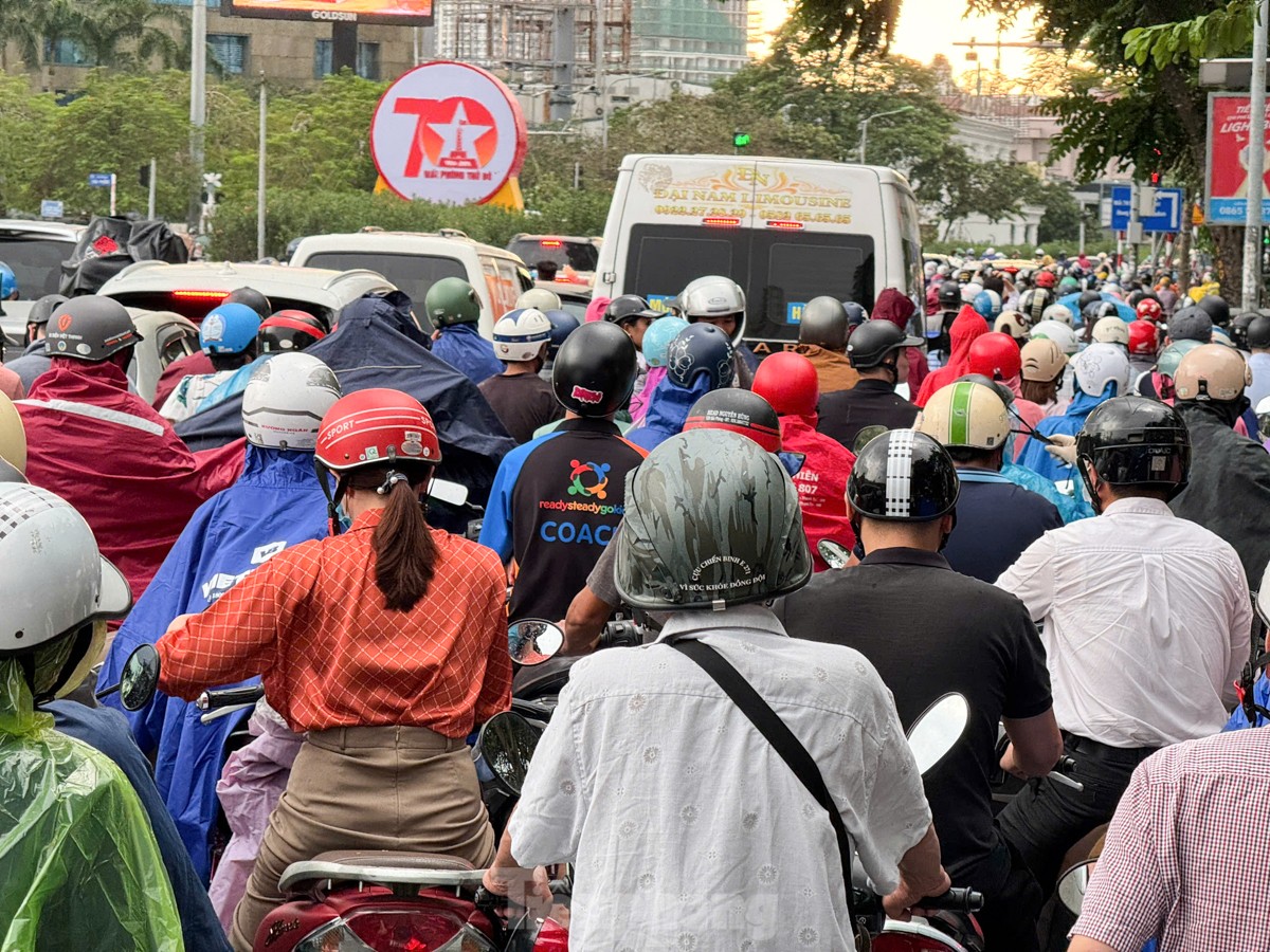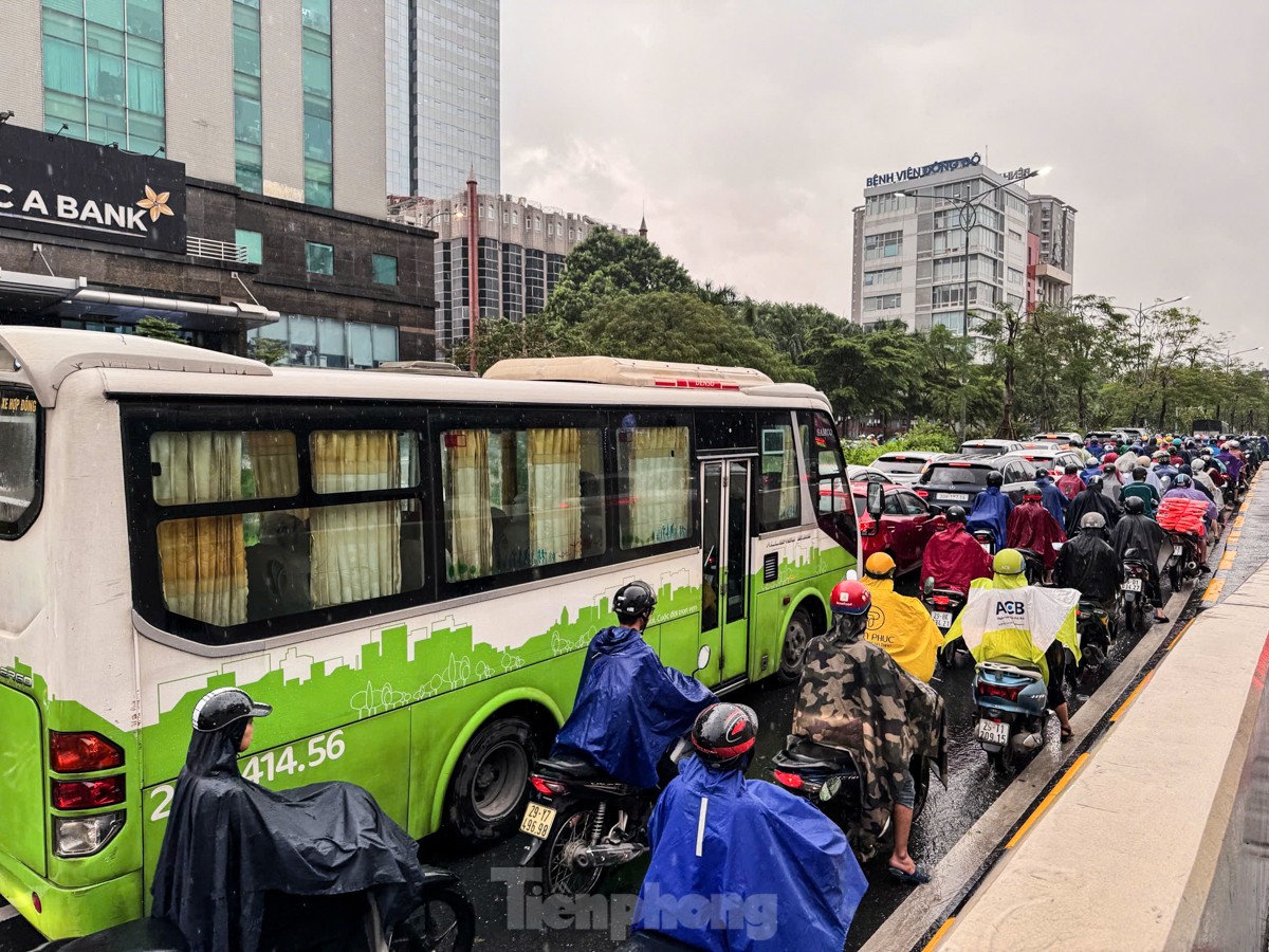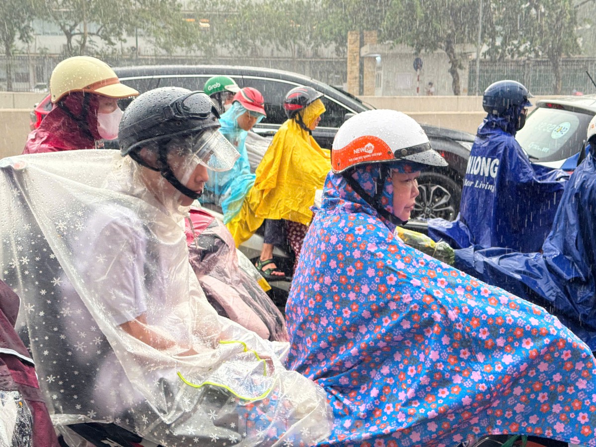 Dòng người nối đuôi nhau trong cơn mưa đúng giờ tan tầm. |