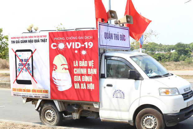 Lực lượng chức năng quận Thủ Đức (đơn vị phụ trách KTX ĐHQG TP. HCM) tuyên truyền cho người dân khu cách ly không nhận tiếp tế hàng hoá.