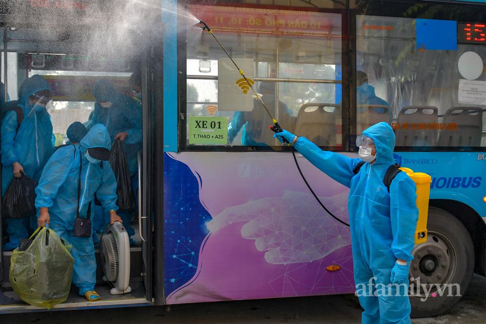 Sáng ngày 29/9, những chiếc xe buýt chở người dân sinh sống tại ngõ 328-330 Nguyễn Trãi, phường Thanh Xuân Trung đi cách ly trở về. Để bảo đảm an toàn, trong suốt quá trình từ trên khu cách ly trở về mọi người trên xe đều mặc đồ bảo hộ.