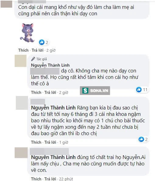 Trong phần bình luận, có người dùng mạng lớn tuổi cho rằng sự việc trên là con dại cái mang, cho rằng bố mẹ phải cẩn thận khi dạy con. Anh Linh lập tức có câu trả lời vừa lễ phép vừa có lý: "Dạ cô. Không cha mẹ nào dạy con làm thế. Họ cũng rất khổ tâm khi con cái họ như thế cô à".