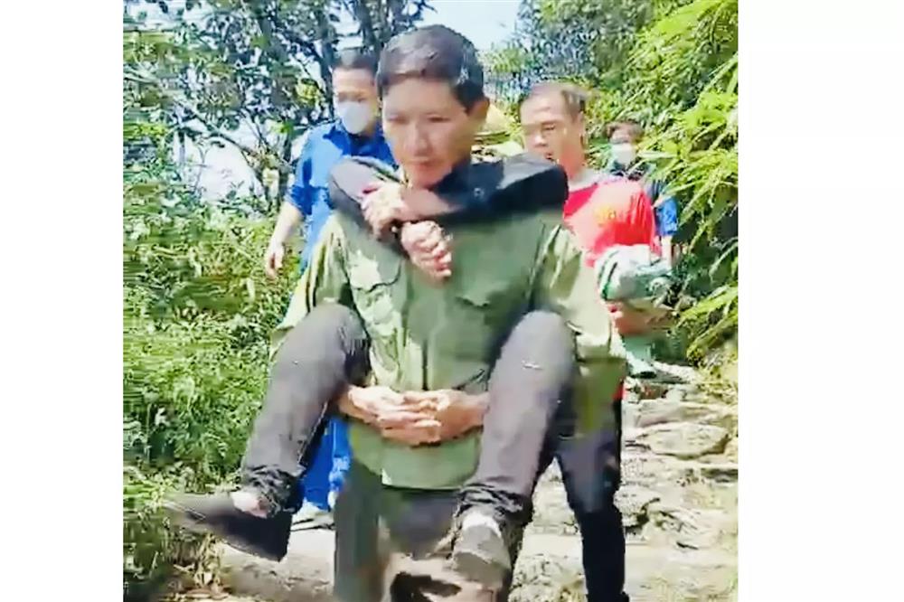 Do quá mệt, bà Liên mệt lả đi và được cõng xuống núi