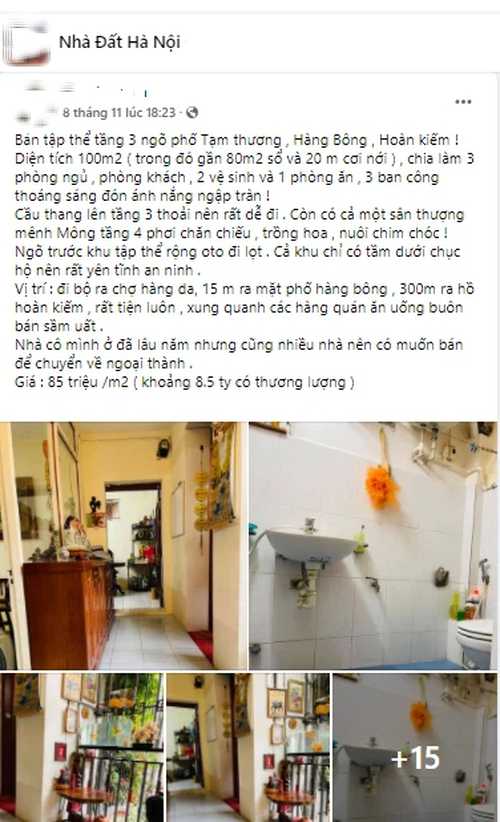 Mới đây, trên mạng xã hội (MXH) xuất hiện thông tin rao bán căn hộ tập thể tầng 3 tại khu vực phố cổ Hà Nội gây xôn xao dư luận. Đáng chú ý, căn tập thể cũ với diện tích 100m2 được người bán đưa mức giá 8,5 tỷ đồng.