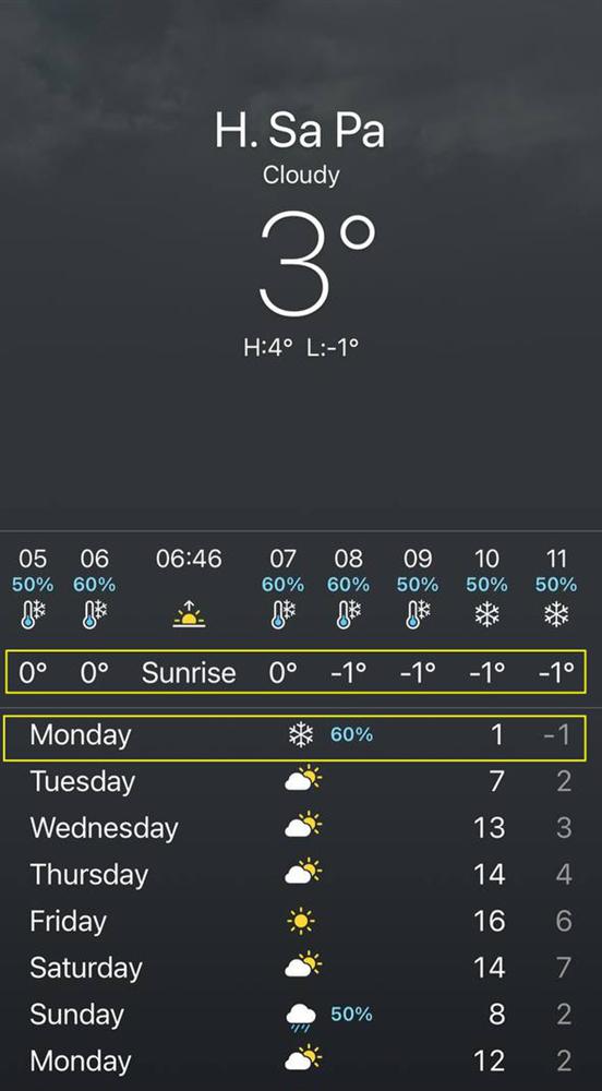 Thiết bị di động cho thấy nhiệt độ chiều 9/1 tại Sa Pa là 3 độ C