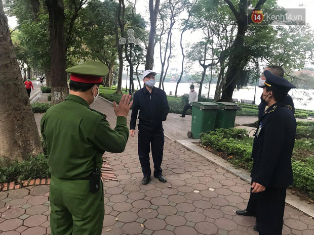Xung quanh khu vực Hồ Gươm với hơn chục điểm túc trực nhân viên bảo vệ để nhắc nhở người dân trở về nhà