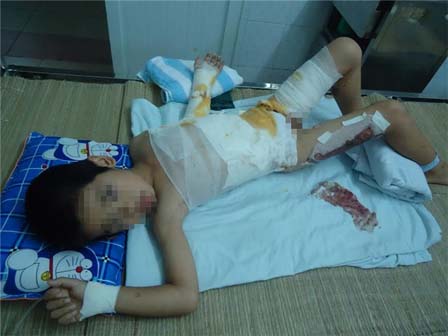 Quá hoảng sợ, gia đình vội vã đưa My lên bệnh viện tỉnh cấp cứu, xong do quá nặng nên chỉ sau 2 tiếng bé lại được chuyển gấp ra Viện Bỏng Quốc gia để điều trị.