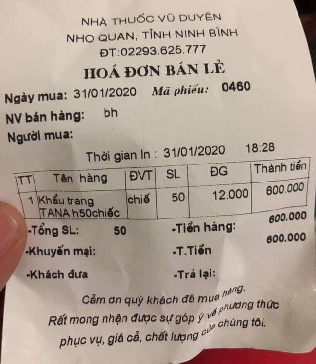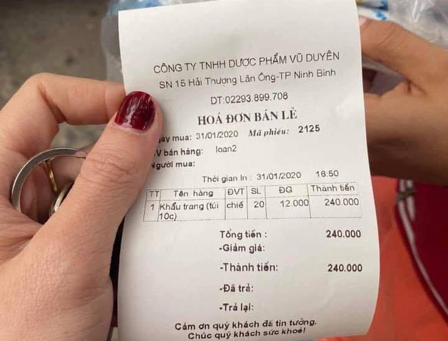 Nhiều người dân tại tỉnh Ninh Bình phản ánh các cửa hàng trong hệ thống Công ty TNHH Dược phẩm Vũ Duyên (tại TP Ninh Bình, huyện Nho Quan, Kim Sơn) đã tăng giá gấp nhiều lần với giá bán khẩu trang là 12.000 đ/chiếc.