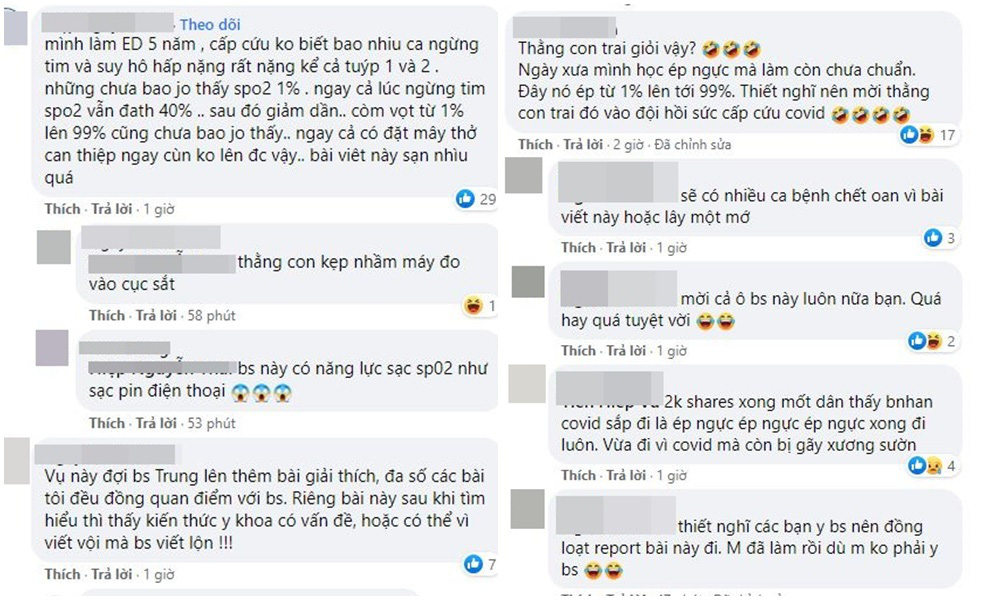 Trước hàng loạt những thông tin y tế đáng ngờ được đưa ra trong bài viết như chỉ số SpO2 của bệnh nhân xuống đến 1%, người không có chuyên môn lại thực hiệp ép tim ngoài lồng ngực thành thục..., nhiều nhân viên y tế, bác sĩ đã lên tiếng.