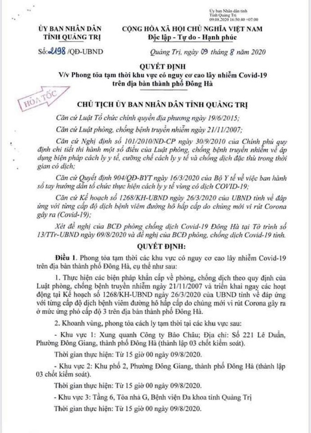 Công văn hỏa tốc của tỉnh Quảng Trị về việc phong tỏa tạm thời 3 địa điểm ở TP. Đông Hà.