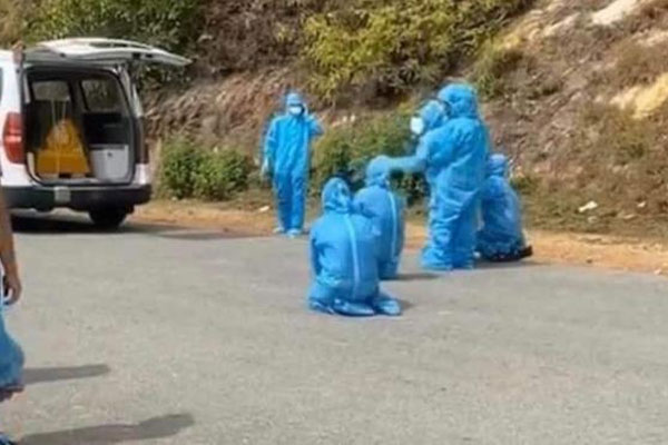 Mới đây, clip ngắn quay lại khoảnh khắc nhóm người mặc đồ bảo hộ quỳ gối tiễn biệt người thân lần cuối được chia sẻ. Clip 2 phút ngắn ngủi là lời cuối cùng trước khi thi thể của bệnh nhân Covid-19 được mang đi hỏa táng.