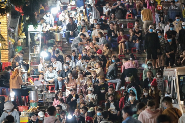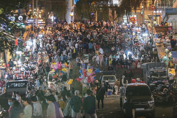 Du khách ngồi chen chúc nhau, chật kín khu vực cầu thang xuống chợ Đà Lạt