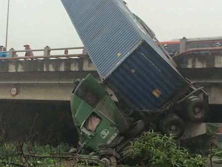 Thời điểm trên hai xe đầu kéo biển số Quảng Ninh và xe tải biển số Cần Thơ lưu thông hướng Gia Lâm về Hà Nội bất ngờ lao vào dải phân cách giữa đường. Đúng lúc này lái xe container biển số Hải Phòng chạy chiều ngược lại hoảng hốt đánh lái sang phải khiến xe lao xuống đất cách mặt cầu khoảng 3 mét.