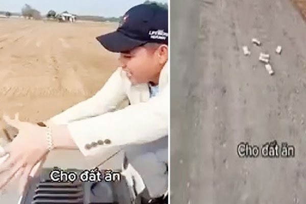 Hình ảnh L. rải tiền với ngụ ý “cho đất ăn” gây phản cảm. Ảnh cắt từ clip