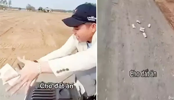 Trước khi thả tiền xuống đất, L. nói: “Nói chung là, ông bà ta có câu muốn giàu nuôi cá, muốn khá nuôi heo, nuôi thì phải cho ăn. Còn mình á, mình muốn giàu thì mình nuôi đất”. Sau đó, L. mang một túi xách chứa nhiều cọc tiền ra và nói đây là đồ ăn… rồi ném tiền xuống.