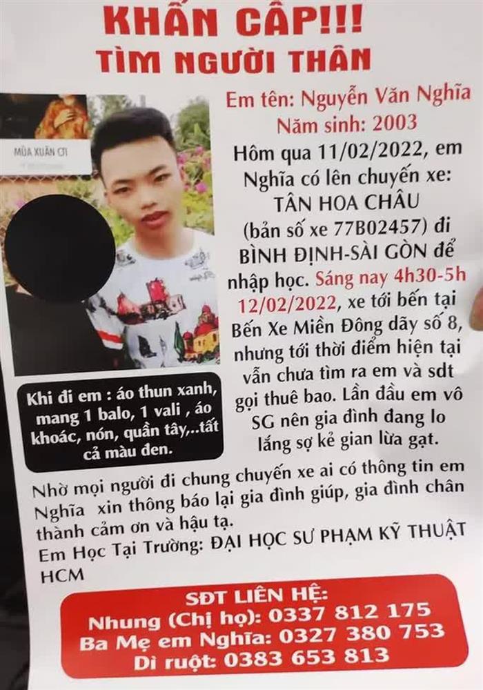 Trước đó, gia đình có đến Công an phường 26, quận Bình Thạnh trình báo về việc em Nguyễn Văn Nghĩa mất tích. Theo trình báo, Nghĩa là sinh viên năm thứ nhất Trường Đại học Sư phạm kỹ thuật TP HCM. Trong năm 2021, do ảnh hưởng của dịch Covid-19 nên Nghĩa ở nhà học online. Ngày 11-2, Nghĩa vào TP HCM để làm thủ tục nhập học tập trung tại Trường Đại học Sư phạm kỹ thuật TP HCM.
